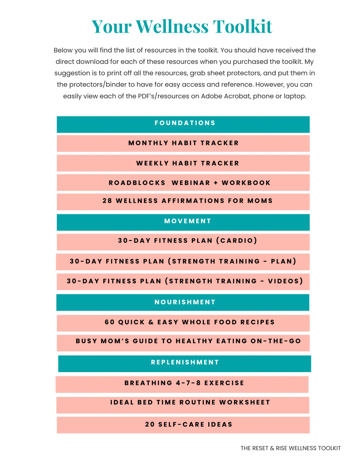 Inside the Reset & Rise Wellness Toolkit is ten simple, but powerful resources to help you nurture your mind, body, and soul so you can show up as your best self without the overwhelm.